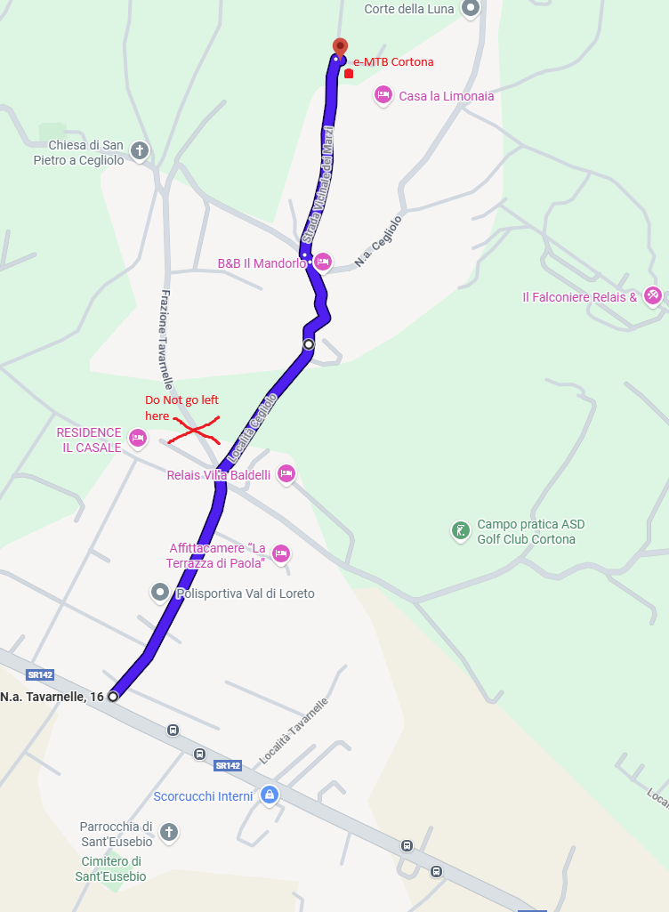Search for: e-MTB Cortona on Google maps and choose to navigate to the location (Casa la Limonaia is on our property) . By default, Google Maps may direct you along a more difficult route with a sharp turn. We recommend following the directions below instead for an easier approach.